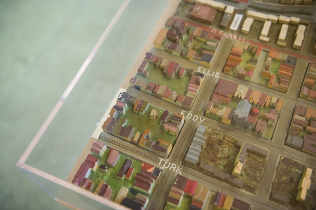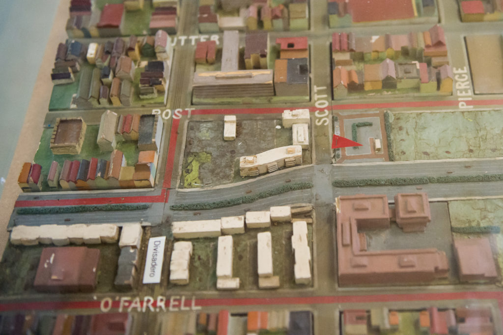 These scale model pieces continued to be used as a planning tool by the city into the 1950s. The red lines that run from Van Ness Avenue to Divisadero Street represents the city’s proposed Western Addition A1 Project from 1956, a redevelopment plan that destroyed hundreds of homes and displaced many more in the pursuit of “clearing blight,” an effort that inordinately targeted black residents in a neighborhood abutting the tony, mostly white neighborhood of Pacific Heights. Though the clay and foam intervention shown is not entirely what was constructed, it represents the forced dispersal of a flourishing community; as James Baldwin famously said, “Urban renewal is Negro removal.” Today, while gentrification has led to a diminished population of these historic communities, they can still find support at the African American Cultural Center and Japanese Cultural and Community Center of Northern California.